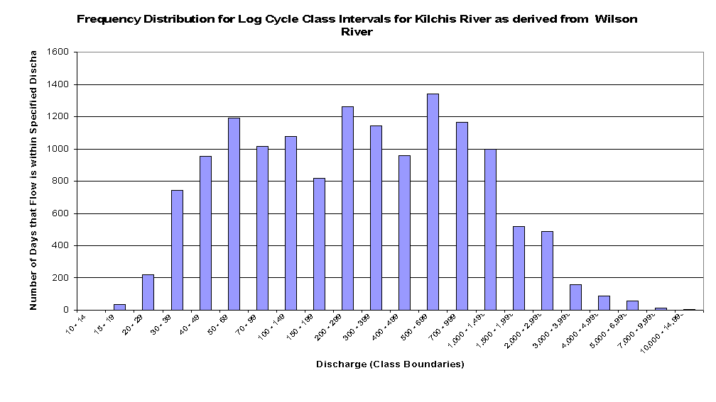 Before constructing the flow duration curve, a frequency distribution (histogram) was constructed for the sorted data to show the general spread of the data. The shape of the resulting figure helps determine if the proper intervals were used in the data sorting process. If the data is sorted properly, the data should take on the general shape of a bell shaped curve with data trailing off at the tail ends while having maximum near the center of the x-axis. Often times, log cycles are used to sort data because the probability of choosing an appropriate interval spacing is higher than if the data were separated into 20 to 30 equal classes. For this example, the data for the Kilchis has been sorted using the log cycles shown in the Microsoft Excel spreadsheet to follow. A graph of the sorted data takes on a general bell shape; therefore, the data need not be re-sorted. Had the shape appeared drastically different from the bell shape, the data may need to be sorted into smaller or larger intervals. If improper intervals are chosen, the amount of information the flow duration curve can provide is diminished. The elongated plateau of peak values suggest that the flow duration curve should be rather flat in the middle range. This allows you to validate your methodology.